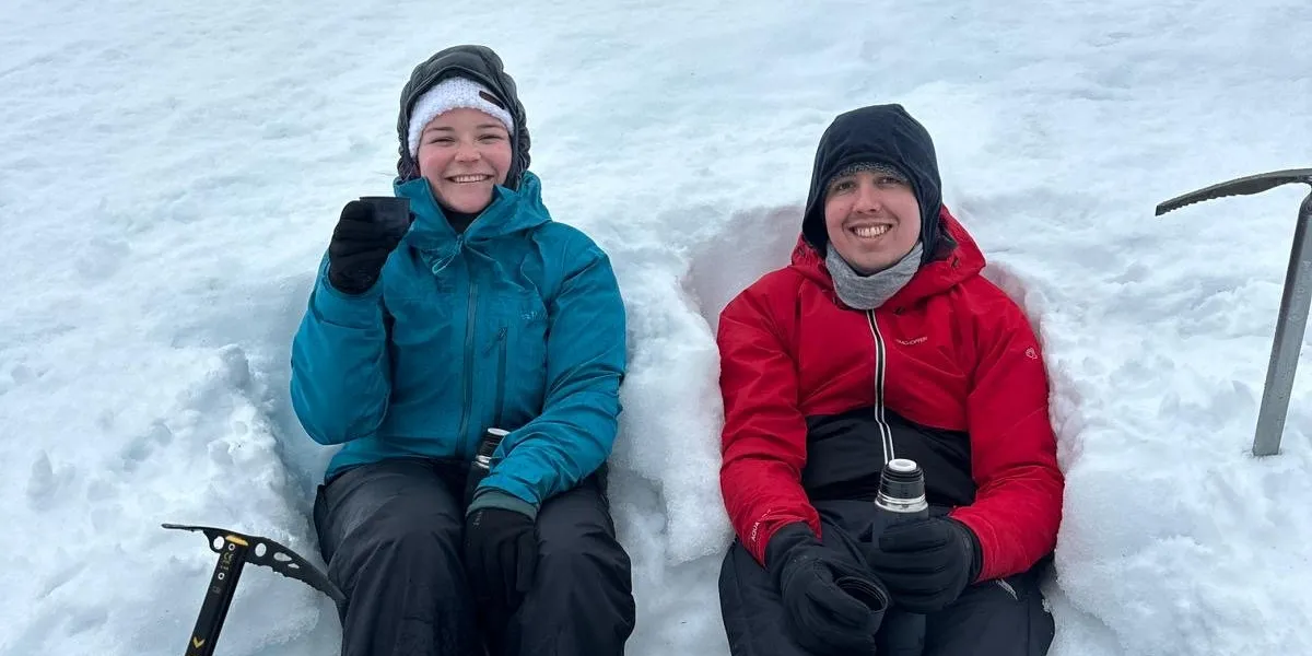 Once we’d done that a few times and really nailed the technique, we moved onto testing out our crampons. Donning these was fairly straightforward, the boots we’d bought were ideal for crampons and it is incredible just how much extra grip and traction these give you on the compact snow.
